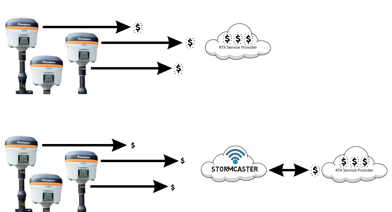 Using the cellular modem in your RTK base station, configure it to use your Stormcaster server credentials and mount your base station to the Stormcaster. This setup is often easier than configuring for a UHF radio. One base station can serve an unlimited number of rovers. You may not even need your own base if you are sharing someone else's or using our RTK-Bridge feature.